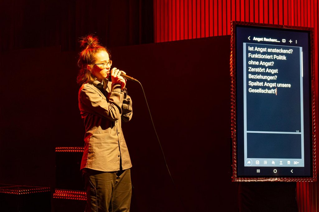 Auch visuell überzeugte die Inszenierung durch kreative Einfälle. In immer neuen Konstellationen glitzerten die roten, grünen und gelben Perücken der Darstellenden im vorherrschenden dunkelblauen Licht (Joanna Karaszewska und Andreas Wagner) der Bühne auf. Ein Bildschirm, der das Smartphone der «Regisseurin» spiegelte, warf Fragen auf, inwiefern Angst unsere Gesellschaft spalte und wer am Ende davon profitiere. Auch erforscht eine zittrige Handykamera wie aus einem Horror-Film das unheimliche Geräusch unter der Zuschauertribüne. Dort offenbart sich schliesslich eine einfache, aber wirkungsvolle Erkenntnis: Nicht nur Menschen haben Angst vor Hasen – auch Hasen fürchten sich vor Menschen.