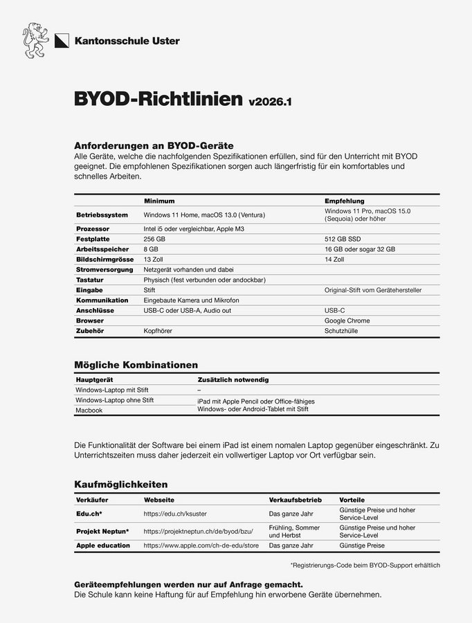 BYOD: Geräteanforderungen für den Unterricht an der Kantonsschule Uster