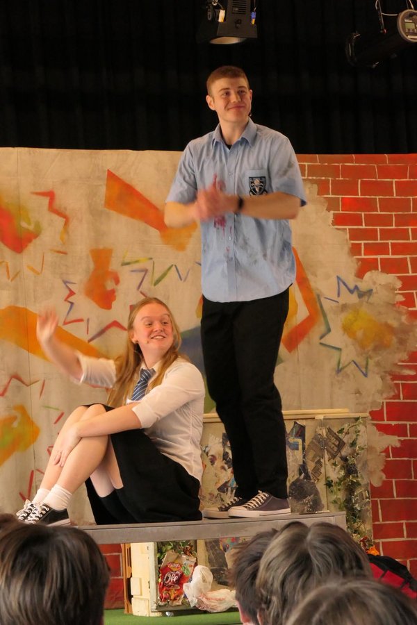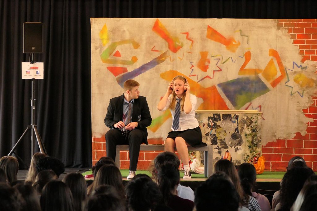 Es gab zwei Vorstellungen für die verschiedenen 5. und 6. Klassen. Dabei wurden die Schülerinnen und Schüler von einem schlichten Bühnenbild empfangen. Zwei Personen standen auf der Bühne: Hannah und John, die zwei Protagonisten. Sie hatten nur wenige gemeinsame Werte und auch religiös gab es Differenzen. Doch Hannah, eine Jüdin und John, ein Muslim, fanden nach anfänglichem Streit, geprägt von Vorurteilen und Klischees, zueinander. Die einzelnen Figuren waren aber auch von inneren Spaltungen, beispielsweise wegen eigener verschiedener Nationalitäten und Kulturen, betroffen. Bei John waren es die Eltern, der Vater Engländer, die Mutter Syrerin, die aus komplett unterschiedlichen Kulturen stammten, innerhalb derer sich der Protagonist wiederfinden musste.